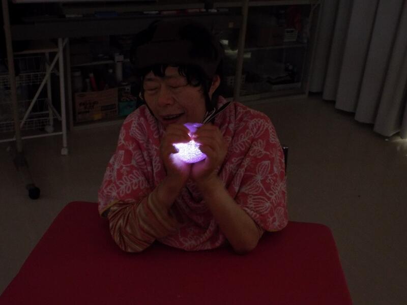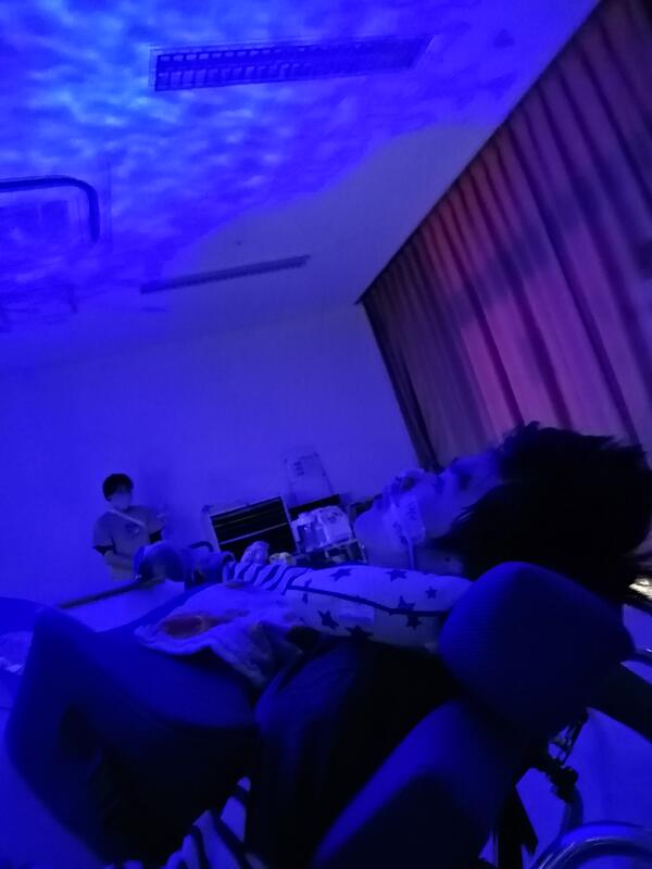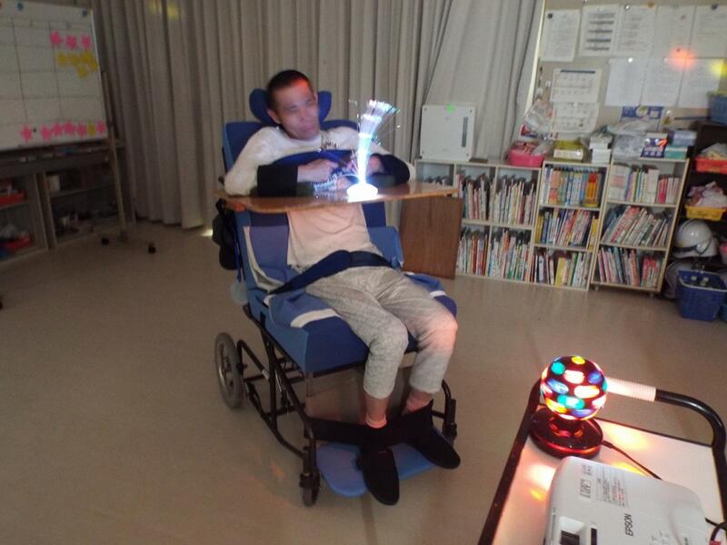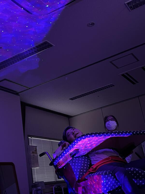 「南の島のハメハメハ大王」の曲に合わせてダンスをしたり、壁や天井に映し出される光にうっとりしたりして、楽しい音楽の時間を過ごしました。