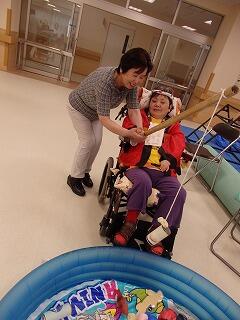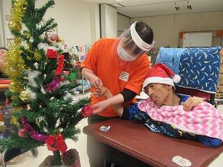 12月中旬は、お楽しみ会を3グループに分かれて実施しました。クリスマスツリーを完成させるために、みんなで協力して、魚釣りの要領でクリスマスオーナメントの飾りを釣りました。それぞれに釣った飾りを貼り付けて、立派なツリーが完成し、点灯式を楽しむことができました。サンタさんも登場し、クリスマスプレゼントをもらったり、記念写真を撮ったりしました。各病棟でのクリスマス会もあり、大いに盛り上がりました!!