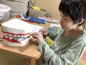 次は歯磨きです。歯の模型に付着した歯垢に見立てた紙粘土の汚れを落としていきます。なかなか落ちない汚れに、歯ブラシを縦にしたり、横にしたりして一生懸命汚れを落としていました。自分の歯磨きの仕方について見直す良い機会になりました!