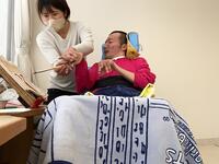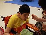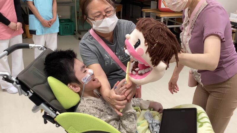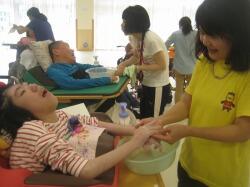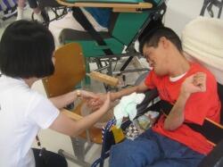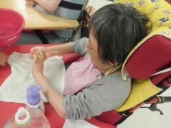 まずは手洗いです。ハンドソープをつけて職員と一緒にお湯の中で手をゴシゴシキュッキュッ。しっかり洗った後は、指先を動かして手洗いの感触をかみしめている児童や手がさっぱりして笑顔を浮かべる生徒もいました。