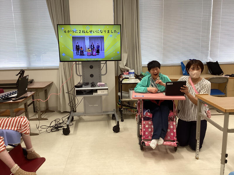 新入生1名が日南くろしお支援学校の体育館で行われた入学式に参加、担任の先生と一緒に入場しました。嬉しいことに、その後の記念撮影のときまで体調が良く、よかったです。また、4月中旬の合同学習では、歌やダンス、ゲームを楽しみました。みんなが集合する楽しいひとときはあっという間に過ぎていきました。