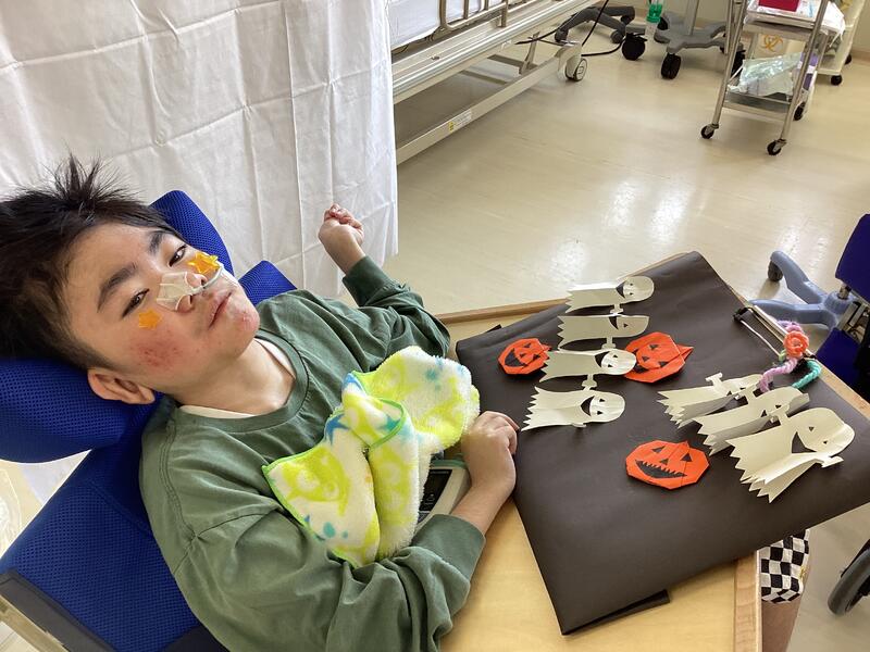 暑くて長かった夏も終わり、訪問教育学級にも、短い秋が訪れました。病院スタッフが夏の間に丹精込めて育てたジャンボカボチャ「アトランチック・ジャイアント」が名前の如く立派に育ち、「ジャック・オー・ランタン」として登場!!ハロウィンの季節を華やかに盛り上げてくれました。訪問教育学級の児童生徒も、思い思いの服装や被り物を身に着けて楽しく仮装し、「トリックオアトリート♪」と病院内を元気に練り歩きました。音声アプリを使って「まだください」「もっとください」「ありがとうございます」等やりとりをする生徒もいました。季節の行事を楽しみながら、他者と関わるコミュニケーション力も育てられた素敵なハロウィンイベントになりました。