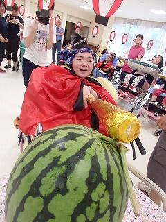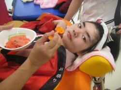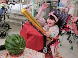 12日(金)の合同学習は、病院スタッフが育てた家庭菜園の大きなスイカが登場!スイカの感触や匂いに、興味津々の児童生徒達。普段の授業ではなかなかできない、貴重な体験をする機会となりました。目隠しをし、棒を持っての本格的なスイカ割りも、大変盛り上がり、楽しいひとときでした。