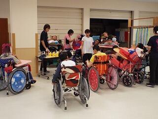 7月4日(木)に3・5病棟の生徒が、7月12日(金)に1病棟の児童・生徒が集まって、7月の合同学習を行いました。夏らしく「七夕祭り」や「盆踊り」、「射的遊び」、「スイカ割り」、「光遊び」を楽しみました。