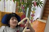 4日(木)は、3病棟の生徒の誕生日!赤い着物を着て七夕の織り姫に扮した生徒に、皆で「おめでとう!」と、歌でお祝いをしました。職員手作りの七夕スケッチブックシアターを鑑賞した後は、一人ずつ前に出て、短冊の願いごとを発表したり、皆で輪になって盆踊りを踊ったりしました。また、紙コップを積み上げたタワーを職員手作りの銃と弾で撃ち落とす「射的遊び」も楽しみました。