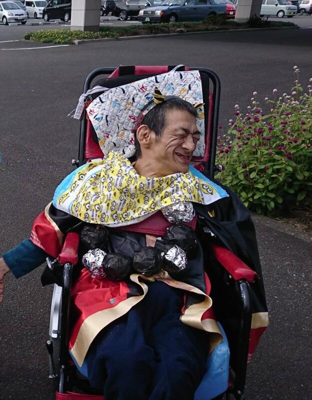 今年度の発表のテーマ曲は「やってみよう」でした。曲に合わせて、桃太郎、鬼ちゃん、かぐちゃん(かぐや姫)、おとちゃん(乙姫)の衣装を着けた4人で、旗を振りながらのダンスを披露しました。また、学習室メンバーで書いた「感謝」の文字のお披露目もしました。実は、この文字は、ひらがなの「ありがとうございます」を組み合わせて、「感謝」の漢字に見えるようにしているものです。ご家族、病院スタッフの方々への日頃の感謝を込めて、みんなで頑張って書きました。