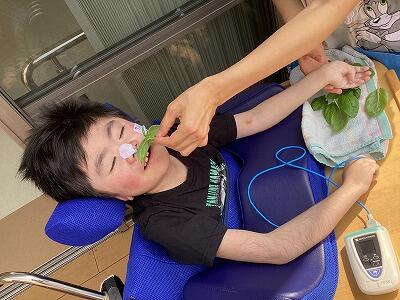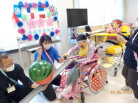 12日(金)の合同学習は、病院スタッフが育てた家庭菜園の大きなスイカが登場!スイカの感触や匂いに、興味津々の児童生徒達。普段の授業ではなかなかできない、貴重な体験をする機会となりました。目隠しをし、棒を持っての本格的なスイカ割りも、大変盛り上がり、楽しいひとときでした。