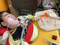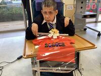 5月18日に行われた本校での体育祭では、たくさんの声援の中、職員や病院スタッフと一緒に徒競走で団テント前を駆け抜けました。訪問教育学級としては数年ぶりのスクーリングで、生徒たちも初めての学校で楽しみ半分、緊張半分だったようです。終わった時はホッとしたようで、みんな笑顔で終えることができました。