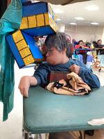 暑くて長かった夏も終わり、訪問教育学級にも、短い秋が訪れました。病院スタッフが夏の間に丹精込めて育てたジャンボカボチャ「アトランチック・ジャイアント」が名前の如く立派に育ち、「ジャック・オー・ランタン」として登場!!ハロウィンの季節を華やかに盛り上げてくれました。訪問教育学級の児童生徒も、思い思いの服装や被り物を身に着けて楽しく仮装し、「トリックオアトリート♪」と病院内を元気に練り歩きました。音声アプリを使って「まだください」「もっとください」「ありがとうございます」等やりとりをする生徒もいました。季節の行事を楽しみながら、他者と関わるコミュニケーション力も育てられた素敵なハロウィンイベントになりました。