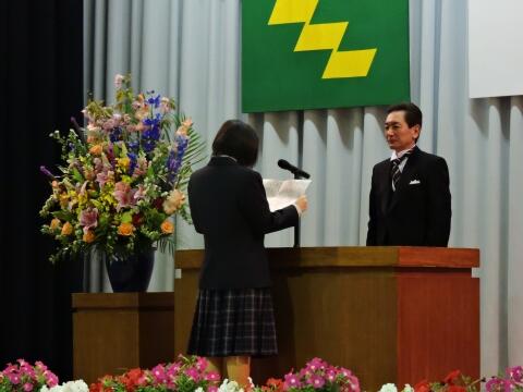 4月11日(水)に入学式があり、本校高等部に新しく9名の生徒が入学してきました。新しい制服に袖を通し、表情から緊張と期待で胸を膨らませている様子がうかがえました。入学生代表として、高等部1年生が誓いの言葉を述べてくれました。その文面には、「友達と仲良く、楽しく、そして ねばり強く 学校生活を過ごしていくことを ここに誓います。」とあり、自立と社会参加に向けて、充実した高校生活を過ごしていきたい気持ちが込められていたように感じました。また、在校生代表の生徒会長の歓迎の言葉からは、先輩としての優しさと見本となって引っ張っていくたくましさを感じました。