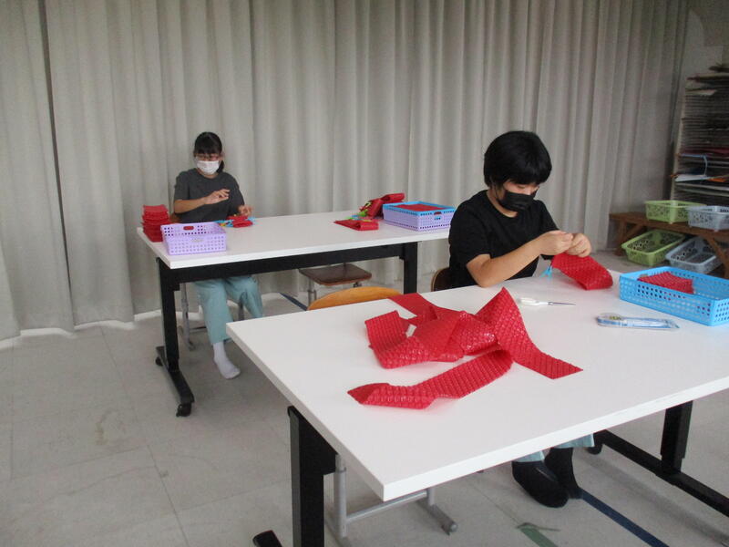 校内実習では、シール貼りや、部品の組み立て・袋詰め、緩衝材カットなどの作業に取り組みました。