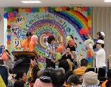 訪問教育学級からは高等部2・3年生が舞台に立ち、本校の日南陽祭で発表した劇「愛泉会高天原物語(あいせんかいたかまがはらものがたり」の中から合奏を行いました。発表の最後には、授業で制作した「あ」「り」「が」「と」「う」の飾り文字を、巻物の留めひもを引っ張ったり、サイコロに貼ったものを転がしたりする形で、一文字ずつ順に皆様にお披露目!大きな拍手をいただき、生徒達はみんな、大満足の表情を浮かべていました。