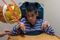 訪問教育学級は、愛泉会日南病院の学習室で、ミニ体育祭を実施しました。競技種目は、「魚釣り」と「ボッチャボーリング」の2種目で、赤・白に分かれて、熱い戦いを繰り広げました。狙った魚を見事に釣り上げ、やったーと喜びの表情を浮かべたり、自分でボールを選んでスロープを使って転がし、倒したピンの数をみんなで数えたり、たいへん盛り上がりました。結果は、赤52点、白59点で、白が優勝 しました。また、高等部3年生の在宅の訪問生徒は、本校の体育祭に参加し、高等部の生徒と一緒に、徒競走・団技「綱引き」・リレーに出場しました。暑い中でしたが、どの競技にも全力で取り組み、最後の体育祭を笑顔で締めくくりました。