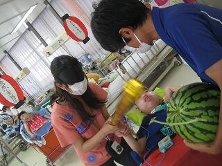 午前の部と午後の部に分かれて、学校の児童生徒と病院の患者さんが一緒になって楽しみました。内容は「すいかわり」「ボウリング」「「さかなつり」「おばけやしき」です。