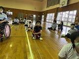 レクリエーション活動では、「フライングディスク」をしました。輪の中に投げ入れる「アキュラシー」、9枚のパネルをディスクで抜く「ディスゲッター」、ディスクを遠くへ投げる「ディスタンス」の三つのゲームを両校の生徒でチームを組んで実施しました。みんなで作戦を立てたり、ゴールが決まったときには「ナイスゴール!」、決まらなくても「ドンマイ!」と声をかけあったりして、笑顔で楽しみました。