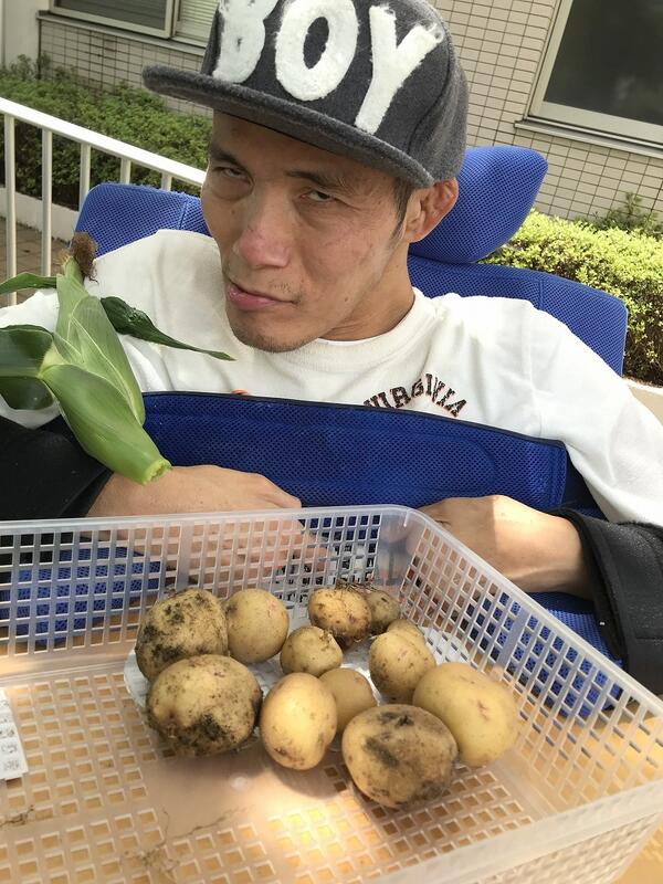 訪問教育学級では、愛泉会日南病院の畑を借りて野菜を栽培しています。先日、アンデスレッドとニシユタカという2種類のジャガイモを収穫した写真です。生徒と一緒に収穫の喜びを味わいました。