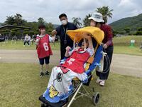 5月18日に行われた本校での体育祭では、たくさんの声援の中、職員や病院スタッフと一緒に徒競走で団テント前を駆け抜けました。訪問教育学級としては数年ぶりのスクーリングで、生徒たちも初めての学校で楽しみ半分、緊張半分だったようです。終わった時はホッとしたようで、みんな笑顔で終えることができました。