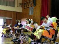 訪問教育学級からは高等部2・3年生が舞台に立ち、本校の日南陽祭で発表した劇「愛泉会高天原物語(あいせんかいたかまがはらものがたり」の中から合奏を行いました。発表の最後には、授業で制作した「あ」「り」「が」「と」「う」の飾り文字を、巻物の留めひもを引っ張ったり、サイコロに貼ったものを転がしたりする形で、一文字ずつ順に皆様にお披露目!大きな拍手をいただき、生徒達はみんな、大満足の表情を浮かべていました。