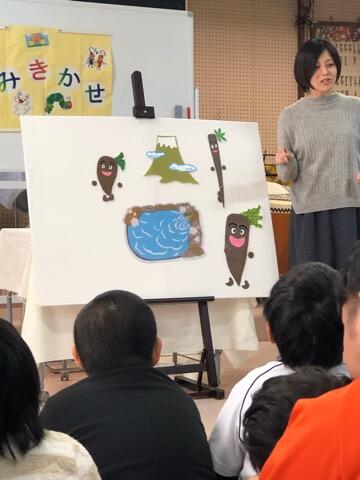 1月15日(水)に、県立図書館の職員の方々による読み聞かせ会が行われました。大きな絵本やパネルシアターに興味津々の子ども達。いざ読み聞かせが始まると、「あははは。」と笑い声が聞こえてきたり、「怖いよ~。」と少しドキドキするお話にびっくりして、絵本の世界に入り込んでいました。子ども達はみんな大満足で、最後は「楽しかったです。」と感想を伝えることができました。