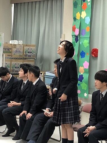会では3年生14名が、一人ずつ卒業後の進路や頑張ることなどを発表してくれました。高等部の思い出を話しながら感極まる生徒や笑顔で就職先での目標を話す生徒、高校生活をどう過ごしてほしいかと後輩たちに話す生徒たちに在校生たちは聞き入り、温かい激励の拍手を送っていました。