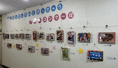 授業で装飾したフォトフレームにいれて、校長室前に掲示しました。