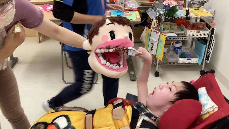 「歯と口の健康週間」(6月4日から10日まで)にあわせて、歯磨きの大切さを学びました。歯磨きの歌を聴いたり、動画を見たり、模型のくろしお太郎君の歯に付いた汚れを落とす体験をとおして、ブラッシングの大切さを知りました。