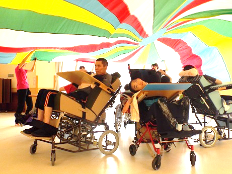 訪問教育学級の生徒との交流グループは、愛泉会日南病院で、本校の訪問教育学級の生徒と交流を深めました。職員の音楽演奏を聴いたり、バルーンで風や色を楽しんだりと、とても楽しい時間を過ごすことができました。午後からは2・3年生グループに合流し、「おおぞら園」での見学も行いました。