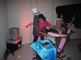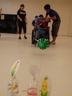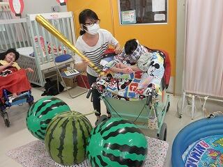 午前の部と午後の部に分かれて、学校の児童生徒と病院の患者さんが一緒になって楽しみました。内容は「すいかわり」「ボウリング」「「さかなつり」「おばけやしき」です。