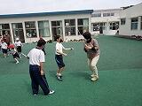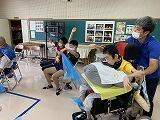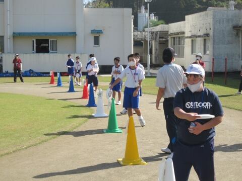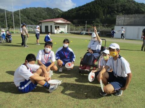 レクリエーション活動では「フライングディスク」をしました。輪の中に投げ入れる「アキュラシー」、9枚のパネルをディスクで抜く「ディスゲッター」、ディスクを遠くに投げる「ディスタンス」の三つのゲームをしました。チームのみんなで作戦を立てたり、声を掛け合って楽しんでいる様子でした。