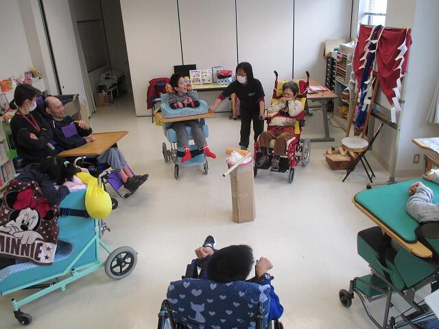 病院でハロウインパレードをしました。授業の中では、ハロウインがどんな祭りなのかを絵本で見たり、ハロウインの仮装を自由にした後、病院の中をパレードして歩きました。リハ室、地域連携室、警備室などに立ち寄りました。スタッフに貰った飴やお菓子を大事にかごの中へ入れて、教室まで持ち帰りました。ちょっとだけ味見をしたり、匂いをかいだりしました。みんなとても満足そうな表情をしていました。