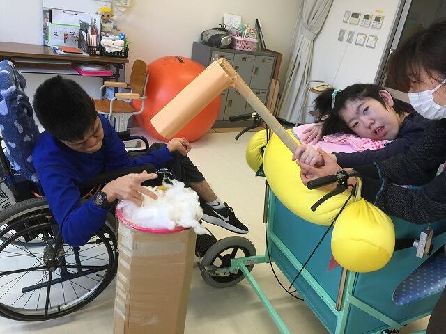 学習室は、くろしお神社が奉られ、門松や獅子舞の置物などが飾られてお正月の雰囲気でいっぱいです。羽根つきをして×の折り紙を顔に付けられて面白がる人やすねる人、凧揚げを楽しむ人、書き初めに勤しむ人もいました。また、合同餅つき大会では、「ぺったんこ、ぺったんこ」と掛け声を掛け合いながら餅に見立てた綿をつきました。最後は本物の餅に触れて粉だらけになりました。