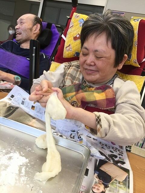 学習室は、くろしお神社が奉られ、門松や獅子舞の置物などが飾られてお正月の雰囲気でいっぱいです。羽根つきをして×の折り紙を顔に付けられて面白がる人やすねる人、凧揚げを楽しむ人、書き初めに勤しむ人もいました。また、合同餅つき大会では、「ぺったんこ、ぺったんこ」と掛け声を掛け合いながら餅に見立てた綿をつきました。最後は本物の餅に触れて粉だらけになりました。