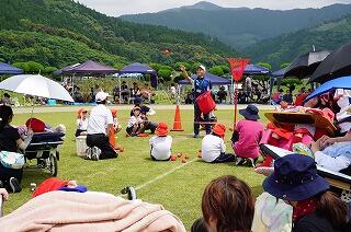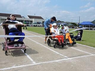 5月21日(土)に日南くろしお支援学校の運動場で体育祭が行われました。気持ちの良い快晴の中、訪問教育学級は16名が参加することができました。児童生徒の中には、初めてあるいは久しぶりの参加となる人もいて、体調や環境の面で心配されましたが、参加を予定していた種目はもちろんのこと最初の入場行進や開会式、準備運動から参加する生徒もいて、みんな元気に青空の下で過ごすことができました。なかには「まだ帰らない」と言う生徒もいました。本校のみんなと楽しくふれあうことができて、思い出に残る有意義な時間を過ごすことができました。