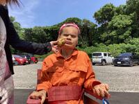 と大きなカブをとるかのように、野菜と結んである紐を一生懸命引っ張り、立派なジャガイモとトウモロコシを収穫しました!収穫した野菜を触ったり、においを嗅いでみたりする中で笑顔もあふれ、とても楽しい時間を過ごすことができました。