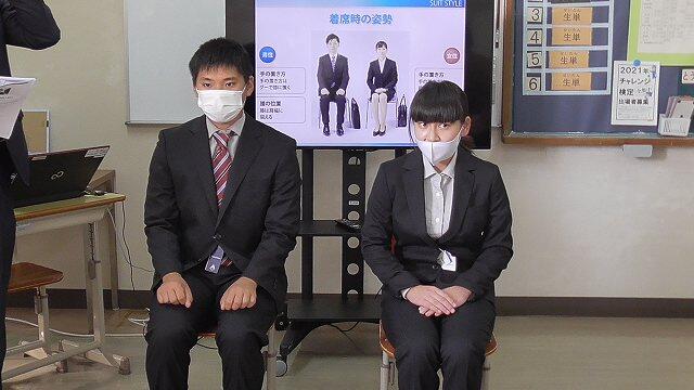 スーツを綺麗に着こなすための選び方のポイントや,ネクタイの色の選び方で与える印象が変わることなど、とても興味深い内容ばかりで、卒業を3か月後に控えた高等部3年生はとても熱心に聞いていました。スーツの試着では、背筋が伸び、ぐっと大人になったような表情が見られました。また、男子生徒は、ネクタイの結び方、女子生徒は髪型やアクセサリーの注意点などについても教わりました。ネクタイの結び方には悪戦苦闘でしたが、卒業までにはぜひマスターしたいものです。