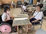 校内実習では、美化班、リサイクル班、チャレンジ班の三つの班に分かれ、「はたらく」学習に取り組みました。「美化班」は、机の修理や洗濯室のペンキ塗り、風田浜のゴミ拾いを行いました。暑い中、机を磨き、カッパを着てペンキ塗りをしたり、風田浜で拾ったゴミを友達と協力して運んだり、みんな一所懸命に取り組みました。「リサイクル班」では、ペットボトルの洗浄、雑巾縫い、ウエス作りに取り組み、リサイクルの大切さも学びました。それぞれができる仕事を分担して行い、時間いっぱい黙々と作業に取り組みました。「チャレンジ班」では、固まった粘土を木槌で砕き、サラサラにした物に水を加えて粘土に戻す作業を行いました。地道な仕事でしたが、一人一人黙々と取り組み、13㎏も粘土に戻すことができました。