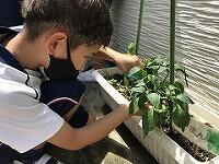 生活単元学習で5月に夏野菜(トマト、ナス、ピーマン)を植えました。子どもたちが毎日、水やりを行ってナスとピーマンが大きく育ったので収穫しました。夏野菜が大きくなる様子を見て収穫を心待ちにしていた子どもたちだったので、収穫できたときは大喜びでした。トマトも順調に育っているので収穫が楽しみです。