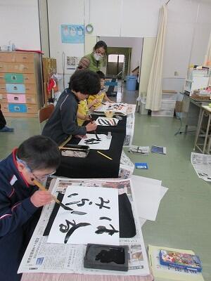 1月18日、1年生にとってははじめての書初めをしました。新年の抱負を決めるのもはじめて、筆を持つのもはじめてでした。ドキドキしながらも楽しそうに筆を動かしていました。紙だけではなく手にもたくさんの墨をつけて、はじめての書初め、かわいい1年生の挑戦でした。新年の抱負は、今年の干支(手形で作ったにわとり)と一緒に教室に掲示しました。