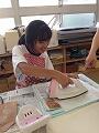 喫茶では、友達や先生を招いてお茶やお菓子を振る舞いました。その後、オクラ農家さんからお借りしたネット2000枚をひたすらひっくり返す作業を行いました。靴洗いでは、友達や先生の靴を丁寧に洗うことができました。タグ作りはアイロンを使う場面もありましたが、けがをすることなく道具を安全に使うことができました。