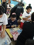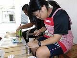 美化班ではトイレの床や壁のペンキ塗りなどの環境整備、リサイクル班では古紙を利用したメモ帳つくりやペットボトルの洗浄、紙すきなど、そして喫茶班では生徒達が休み時間に利用できるカフェをオープンし接客などを行いました。