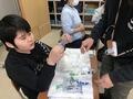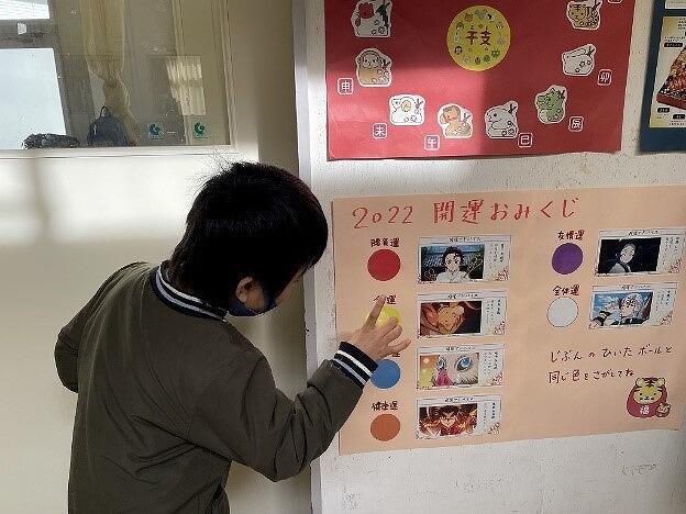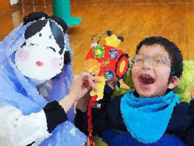 生活単元学習の授業では、お正月遊び「福笑い」。顔のパーツの輪郭をなぞりながら、「目かな?」「鼻かな?」と想像しながら、のせました。出来上がりを見て「わぁ!」。笑顔で楽しみながら学習しました。