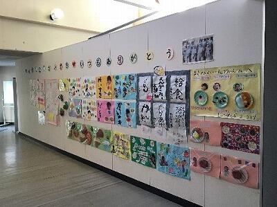 また、今週から給食感謝週間が始まり、スライドを見ながら、給食がどのように作られているのかを知ることができました。美味しい給食ができるまでに携わっている人や、命を頂くことに感謝をこめて「いただきます」や「ごちそうさま」と心を込めて言えると素敵ですね。給食感謝週間に向けて、今年は各学級で作成した作品を給食室に展示しました。
