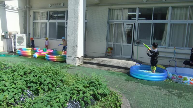 7月15日に魚釣りゲームをしました。図工の時間にカラービニールや気泡緩衝材(プチプチ)で制作した魚やタコ、イカ、ヒトデなどのたくさんの海の生き物を、水の入ったビニールプールに浮かばせて、2人ずつ交代で魚釣りをしました。とにかくたくさん釣りたい児童、狙った魚をゲットしたい児童など、それぞれに楽しみました。この日はとても天気が良く、気持ちの良い時間を過ごすことができました。