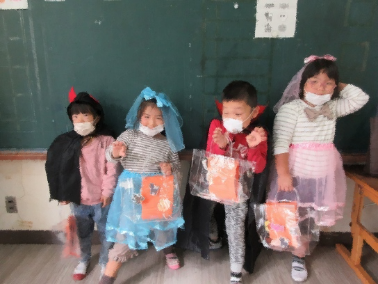 10月28日に小学部の3年生全員でハロウィンをしました。仮装するためのマントを作り、シールラリーをしながら校内を回りました。事務室では、事務長先生からお菓子をもらい、教室に帰ってくると、友達同士でお菓子を見せ合ったり、自分の好きなお菓子を教え合ったりして、子供たちも嬉しそうな様子でした。