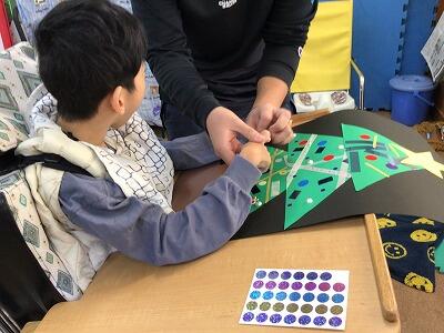 12月17日(木)の生活単元学習で、家族や居住地校交流のお友達に年賀状を作成しました。来年の干支である丑の絵に丁寧に色鉛筆で塗り、見本を参考に時間をかけて、のり付けをしました。出来上がった年賀状を見て「正月にお家に届くよ。」と話すと笑顔の表情も見られました。