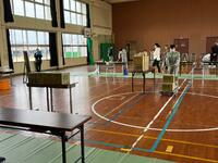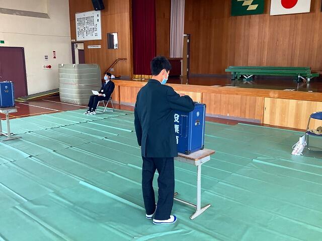 体育館と4棟機能訓練室で生徒会役員選挙の投票が行われました。実際の選挙で使用している投票箱や記載台を借用して本格的な雰囲気の中で行われました。会場では緊張感が漂う中、中学部と高等部の生徒が次々に投票用紙に自分が選んだ候補者の名前を書き、投票箱に足を運んでいました。