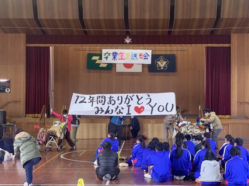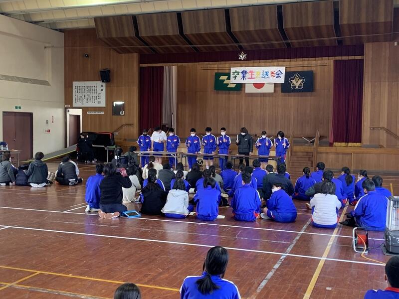 生徒会の企画による卒業生を送る会が体育館で行われました。卒業生や在校生へ感謝の気持ちを表した個人、学年の発表に大いに盛り上がりました。