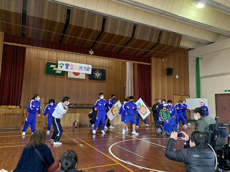 2月18日(金)校内の体育館にて、高等部お別れ遠足、卒業生を送る会が行われました。新型コロナウィルス感染症拡大防止のため、高等部全体で集まっての卒業生を送る会は実施できませんでしたが、学年ごとに分散して予防対策を徹底しながら交流することができました。それぞれの学年が3年生へありがとうの気持ちを込めた歌やダンスそして、この日のために作成した動画を披露し、感謝の気持ちを伝え合いました。限られた時間の中で各学年とも3年生と一緒になって楽しく過ごすことができ、よい思い出をつくることができました。