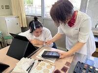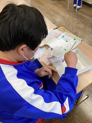 高等部一年生の美術では、「色いろ宝箱を作ろう」という授業を行っています。写真の様子は、お菓子の空き箱に好きな色の折り紙を、張り子の方式で根気強く貼っているところです。学期末までには、宝物を入れたくなるような綺麗な化粧箱が完成する予定です。ちなみに、この授業で使用する糊は生徒たちで手作りしています。材料は小麦粉と水だけのシンプルなものですが、材料から手作りすることで、より作品への愛情が増します。それぞれの生徒がどのような宝物をしまうのか、とても楽しみです!