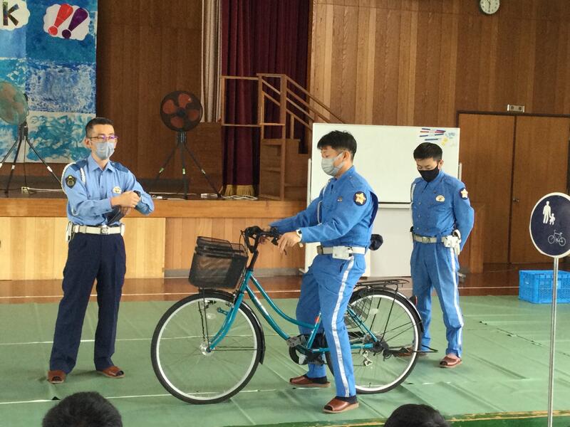 交通安全課の職員が数名来校され、徒歩グループと自転車グループに分かれて交通安全について学びました。